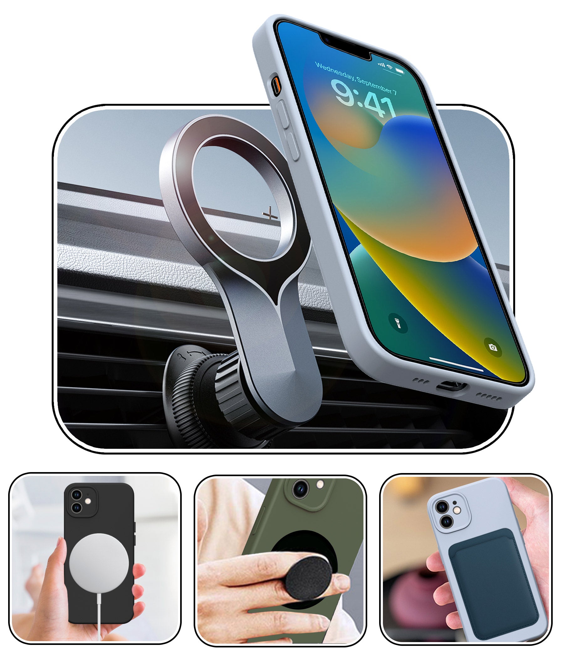 外側はしっとりとした手触りのシリコン素材で、滑りにくく安心のグリップ感を実現。内側には柔らかなスエード素材を使用し、iPhone本体をやさしく包み込みます。外からマグネットが見えないスマートなデザインで、シンプルさと高級感を両立しました。