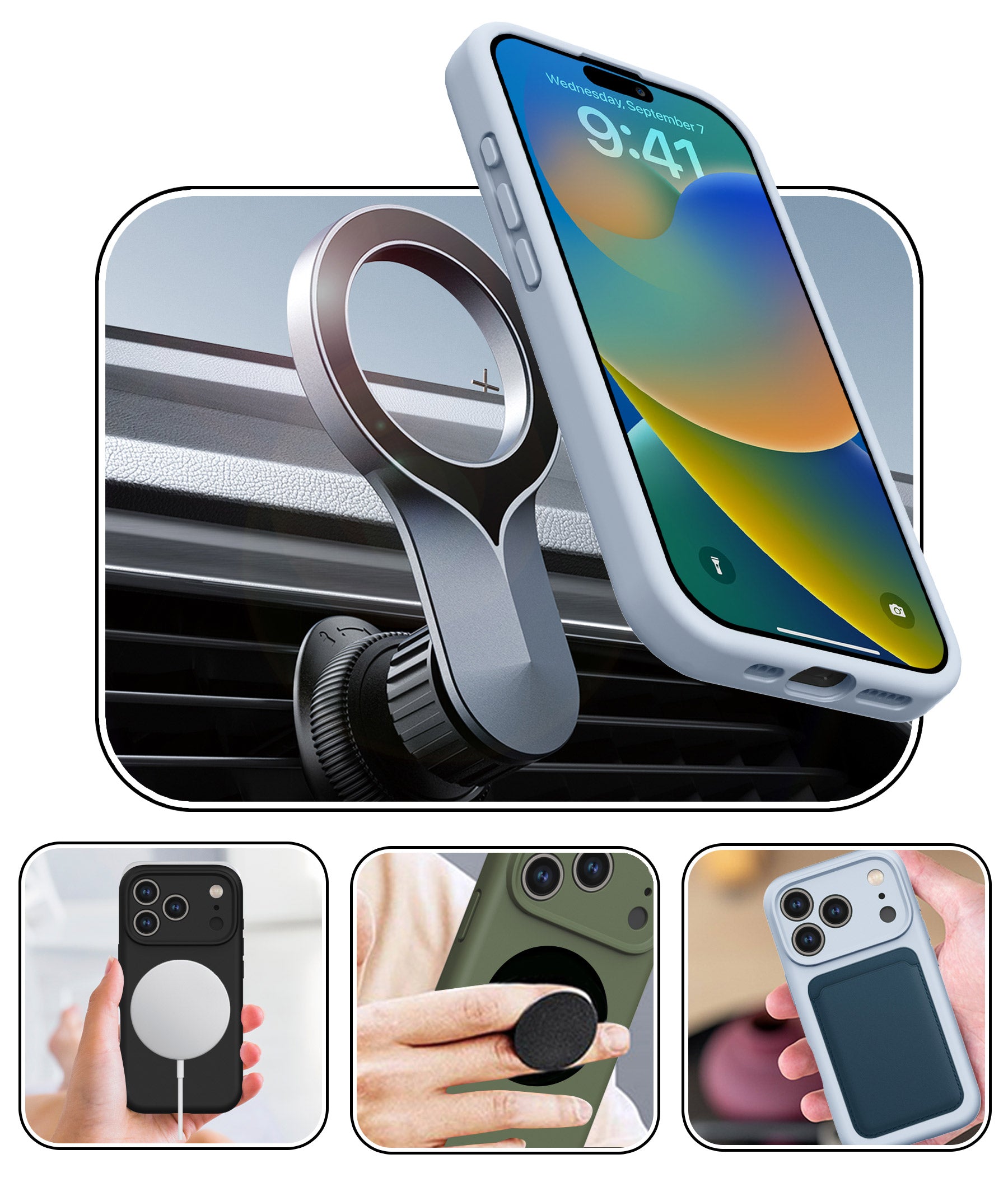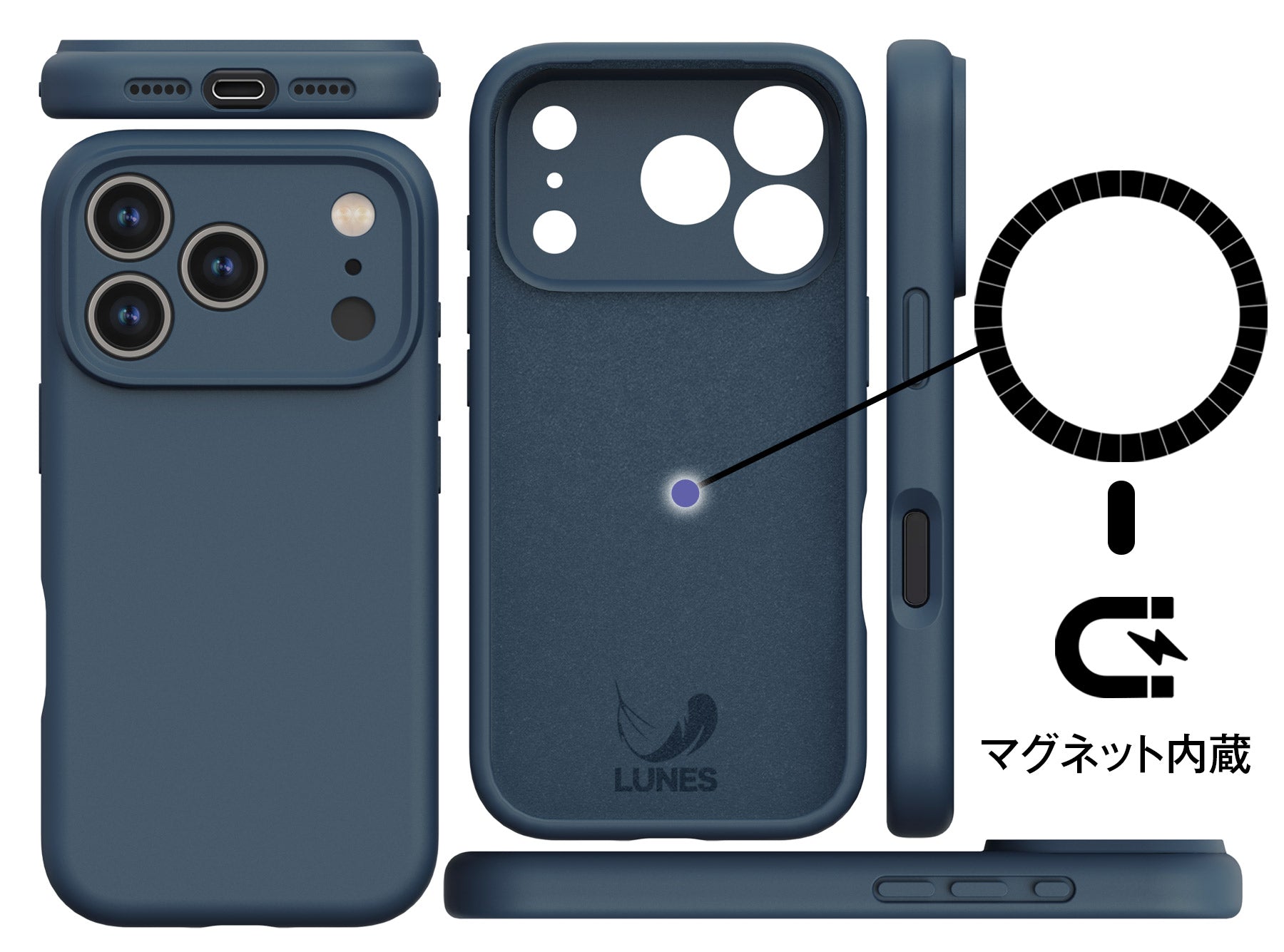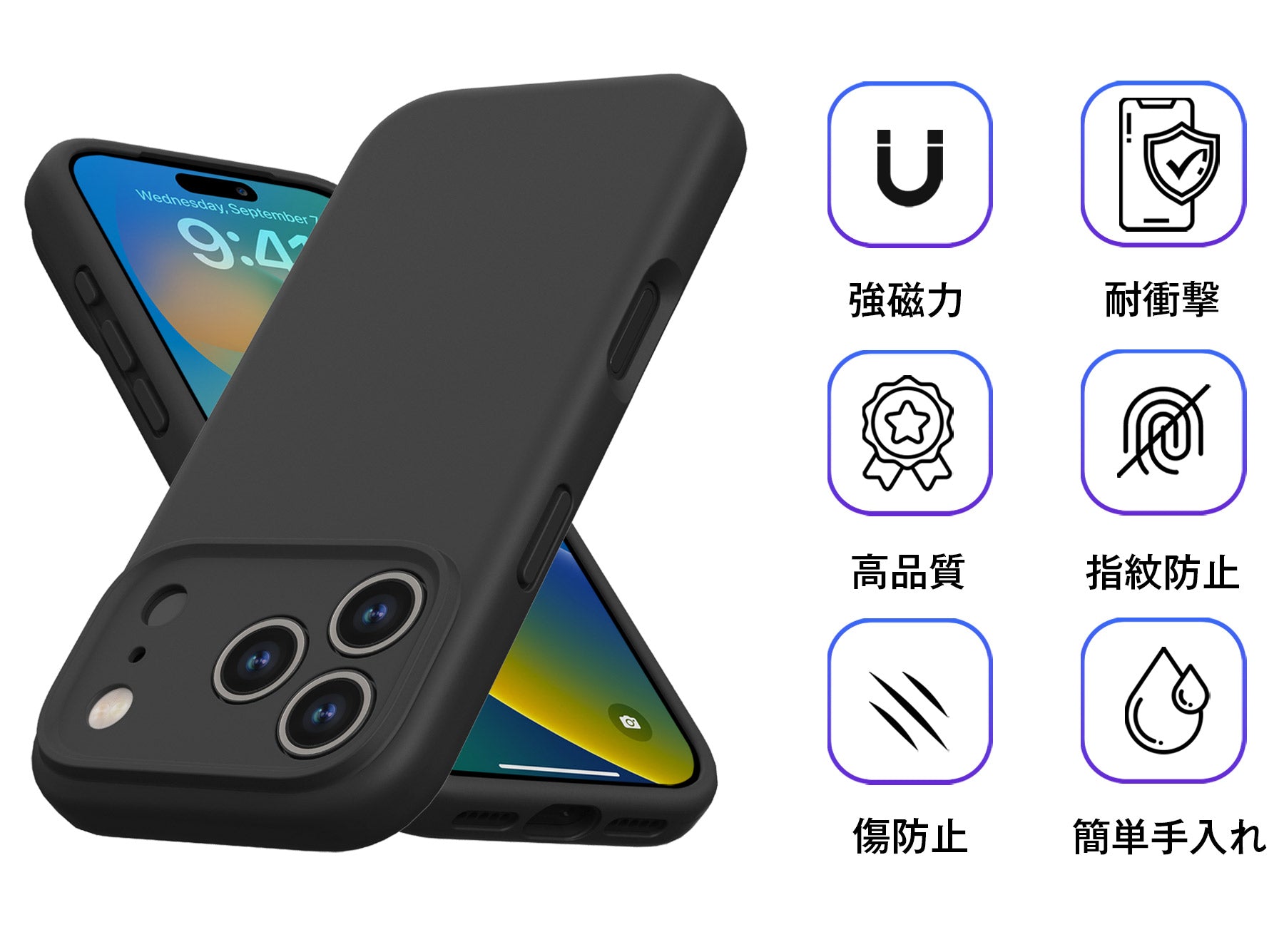 外側はしっとりとした手触りのシリコン素材で、滑りにくく安心のグリップ感を実現。内側には柔らかなスエード素材を使用し、iPhone本体をやさしく包み込みます。外からマグネットが見えないスマートなデザインで、シンプルさと高級感を両立しました。
