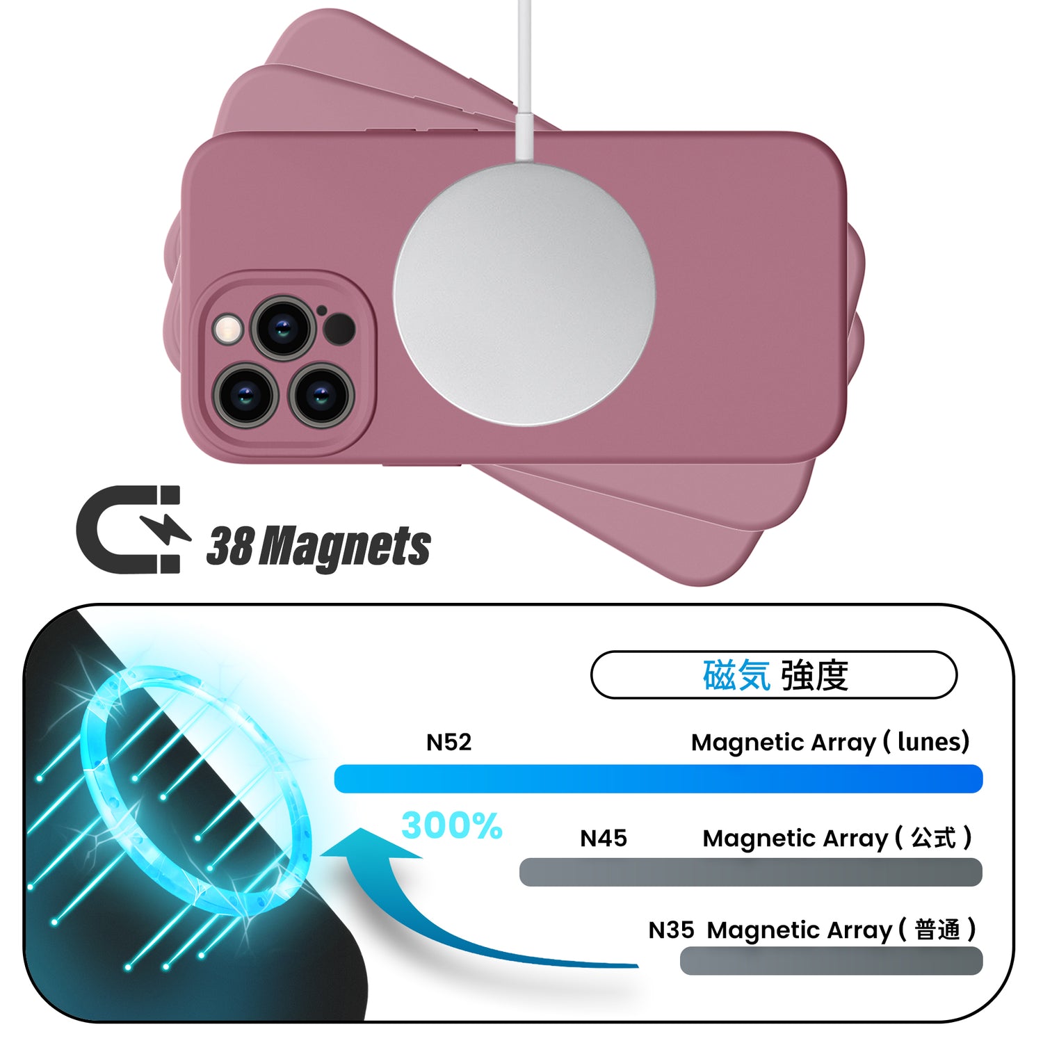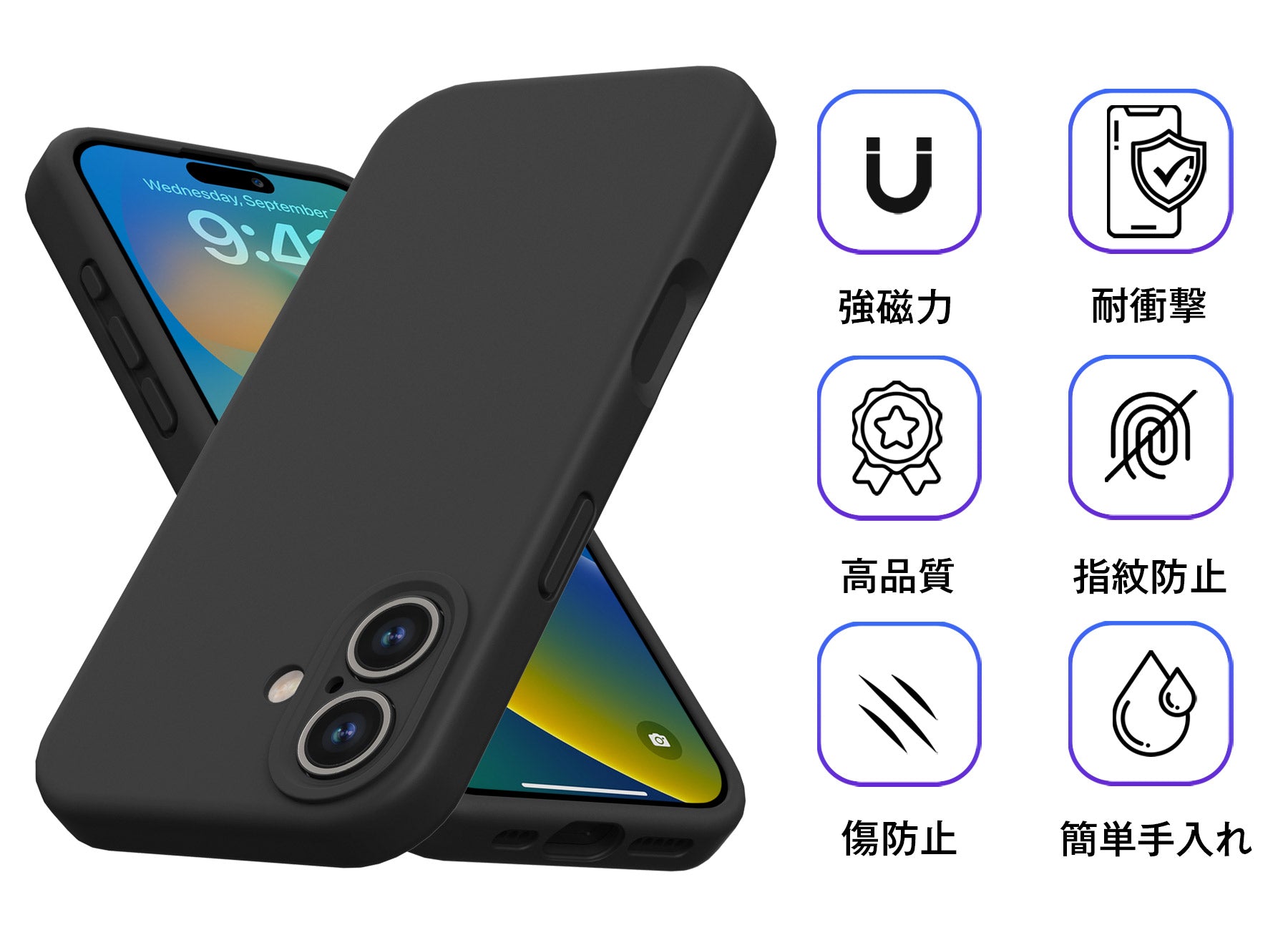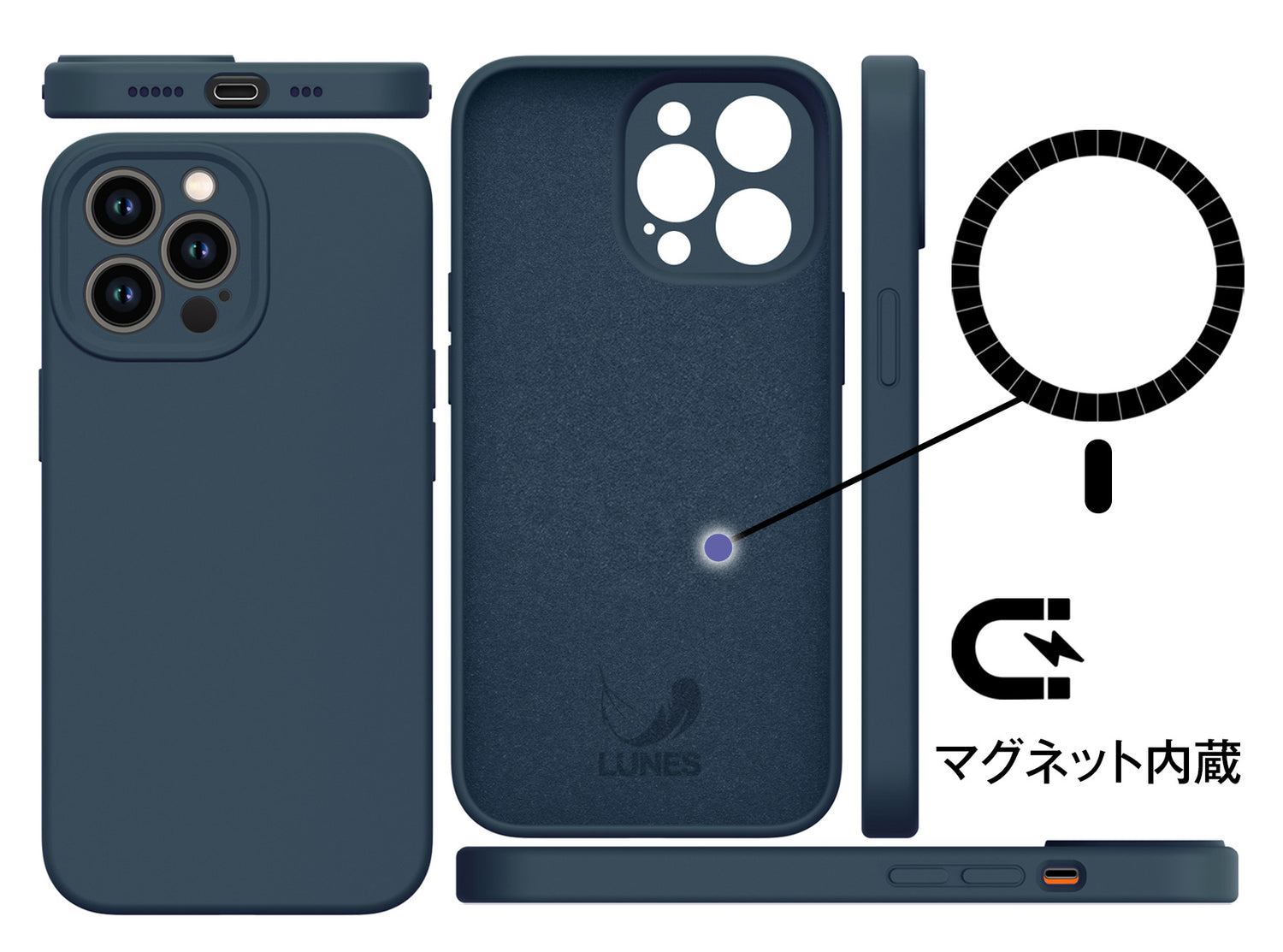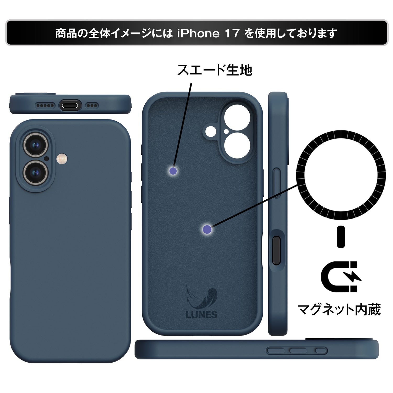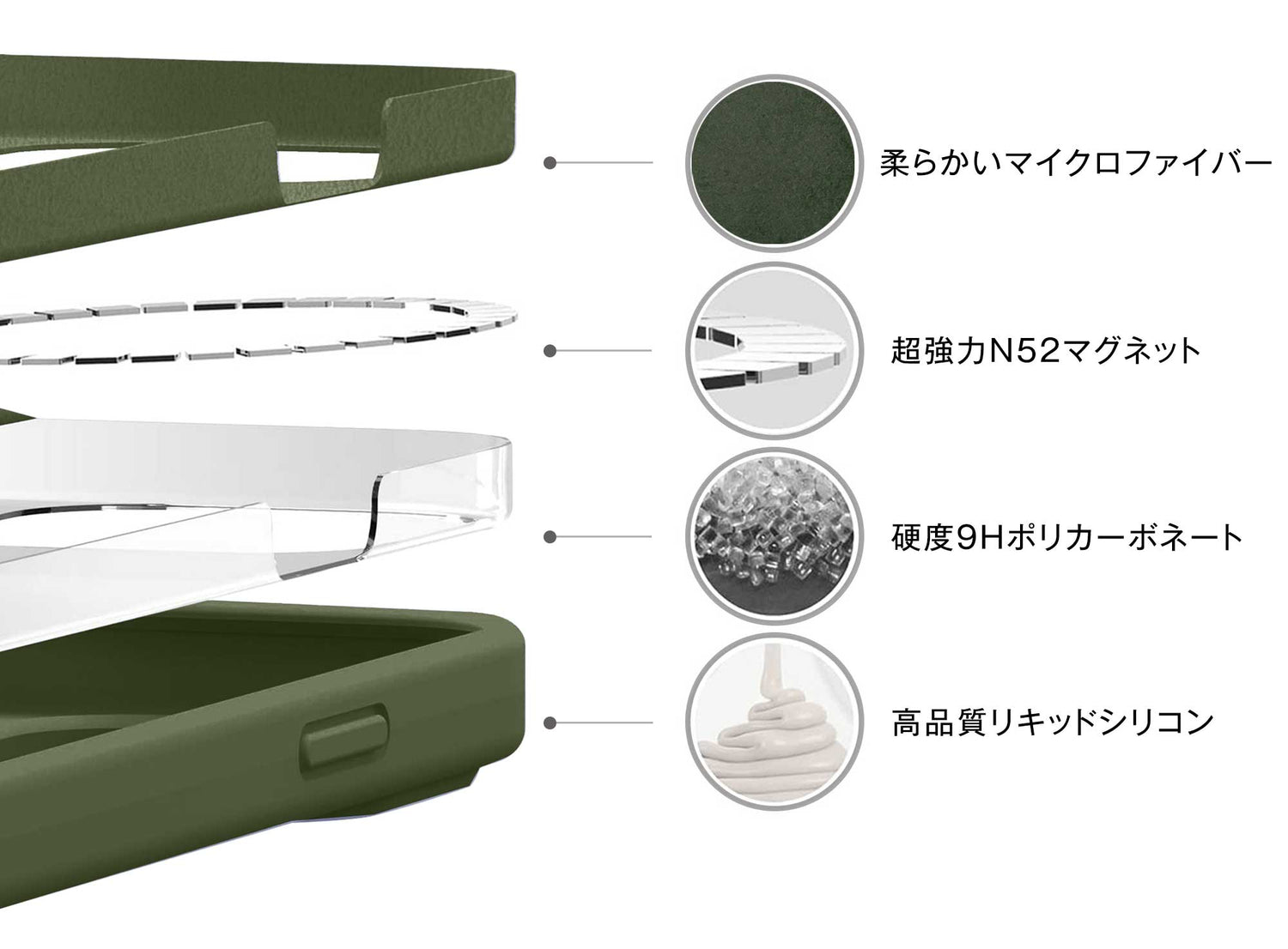 外側はしっとりとした手触りのシリコン素材で、滑りにくく安心のグリップ感を実現。内側には柔らかなスエード素材を使用し、iPhone本体をやさしく包み込みます。外からマグネットが見えないスマートなデザインで、シンプルさと高級感を両立しました。